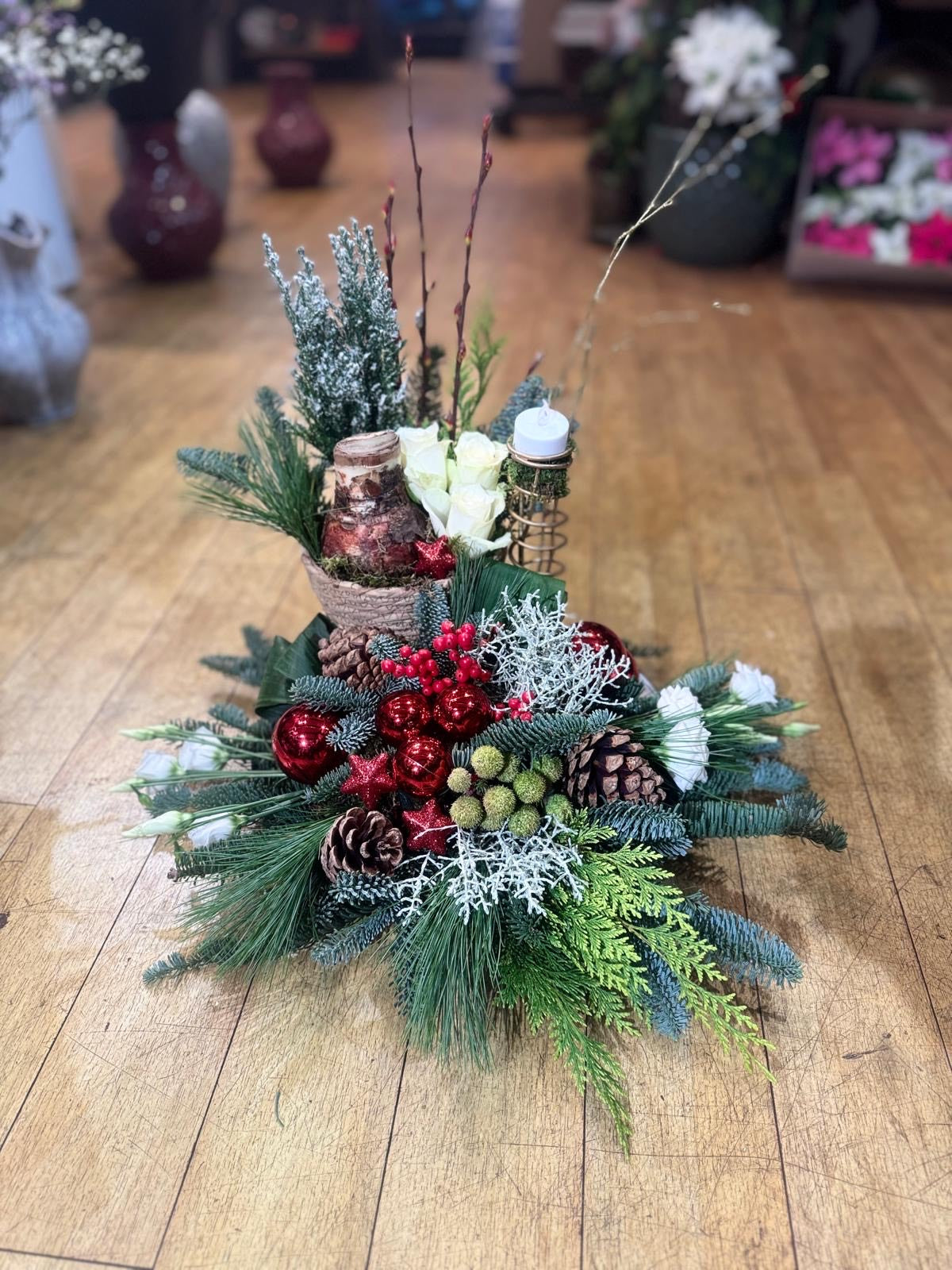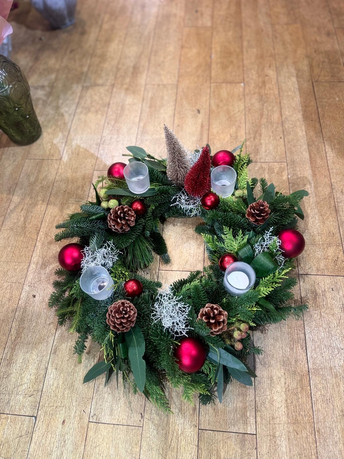 2 Kerstworkshop voorbeelden. Dit jaar kun je uit twee stukken kiezen. Een kerststuk op schaal voor € 59,99 en een mooie grote krans € 49,99